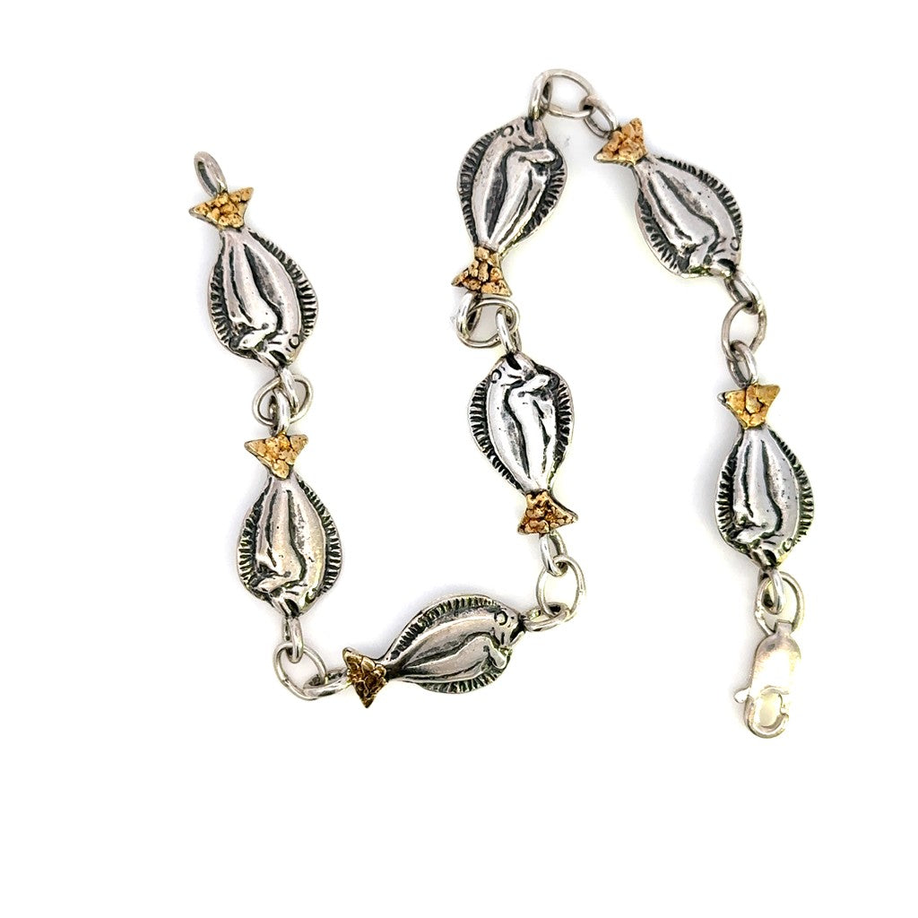 Halibut Link Bracelet Sterling Silver & Alaskan Gold Nugget Two Tone Color 7.5" Long