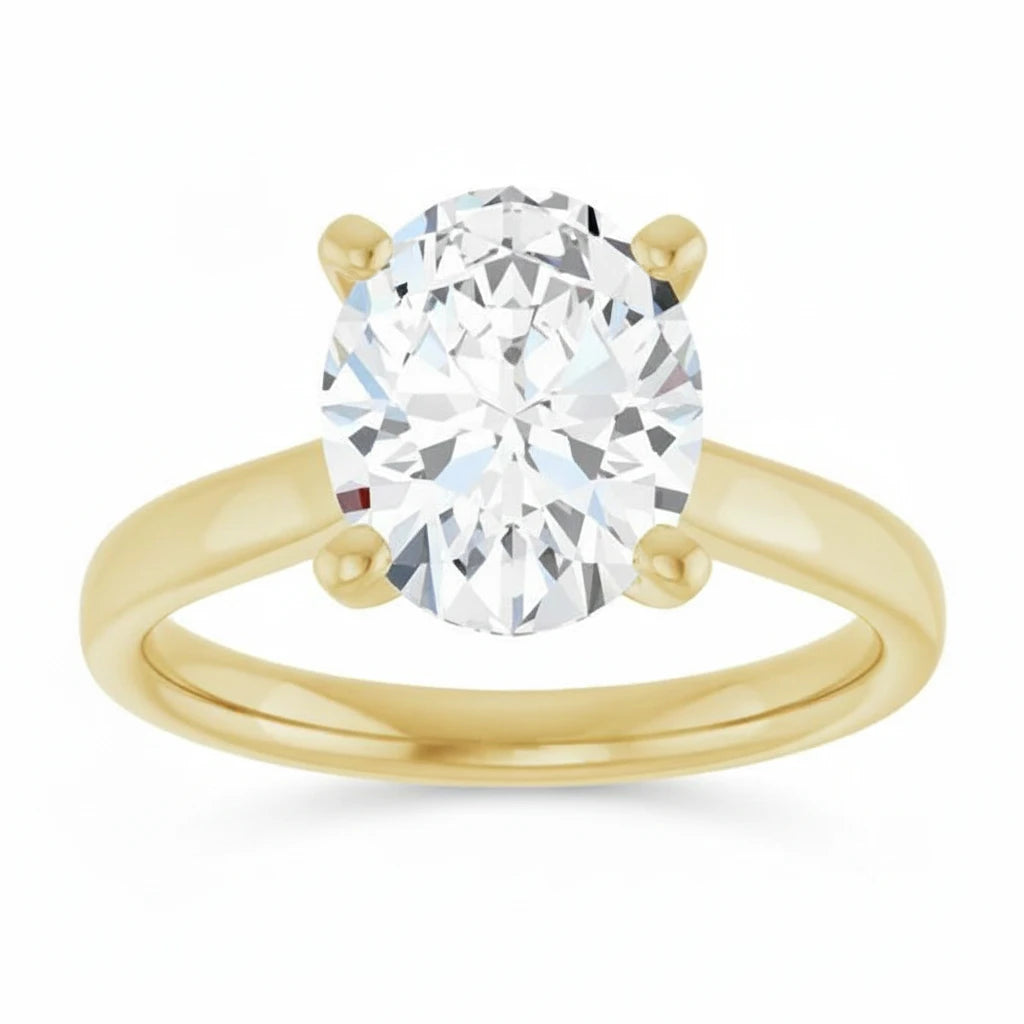 This 14KT yellow gold ring features a striking 2.16 carat (10x8 mm) oval cut diamond set as a classic solitaire, allowing the center stone to take full focus. The warm yellow gold band provides a rich, elegant contrast to the diamond’s brilliant sparkle, while the clean, minimal setting enhances the stone’s elongated shape and radiant fire.