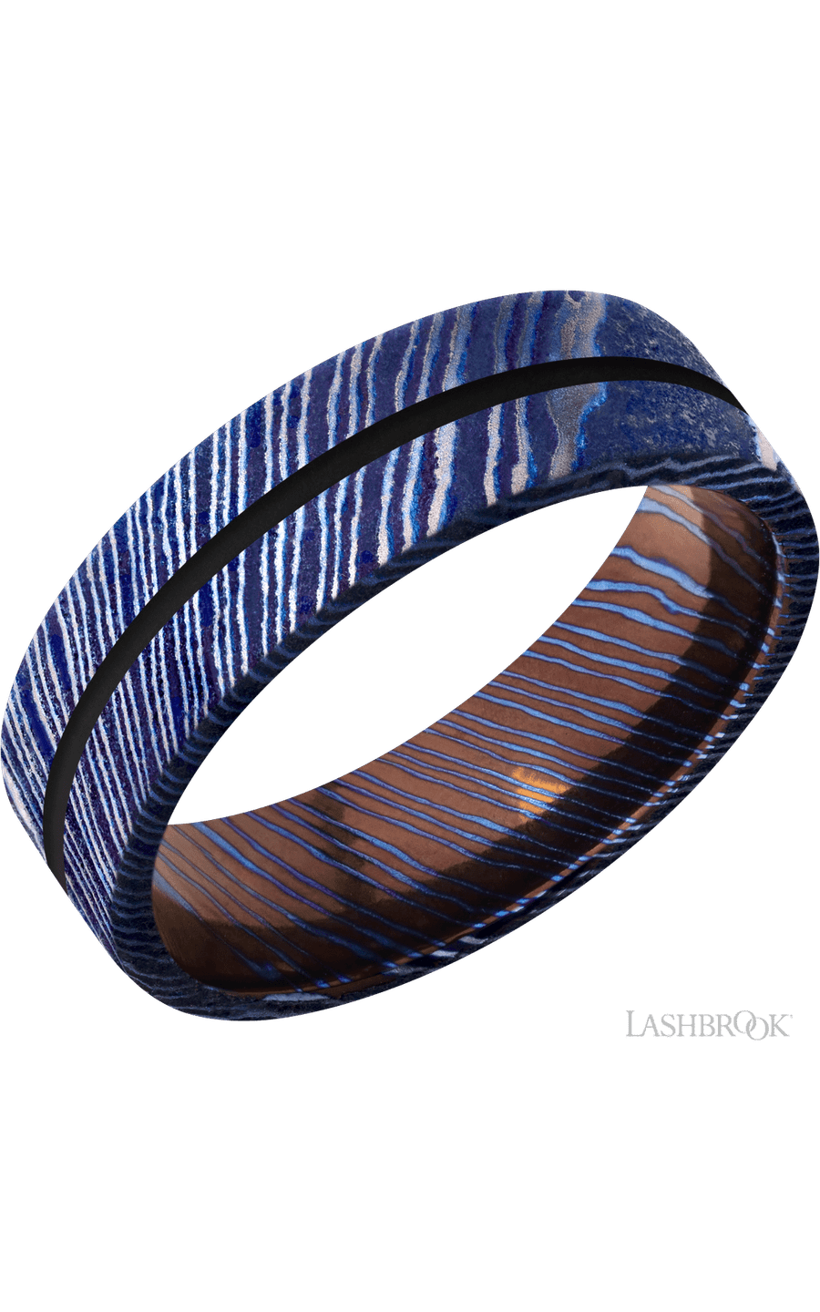 7 mm wide/Flat/Titanium Damascus band with one 1 mm Centered inlay of Black.