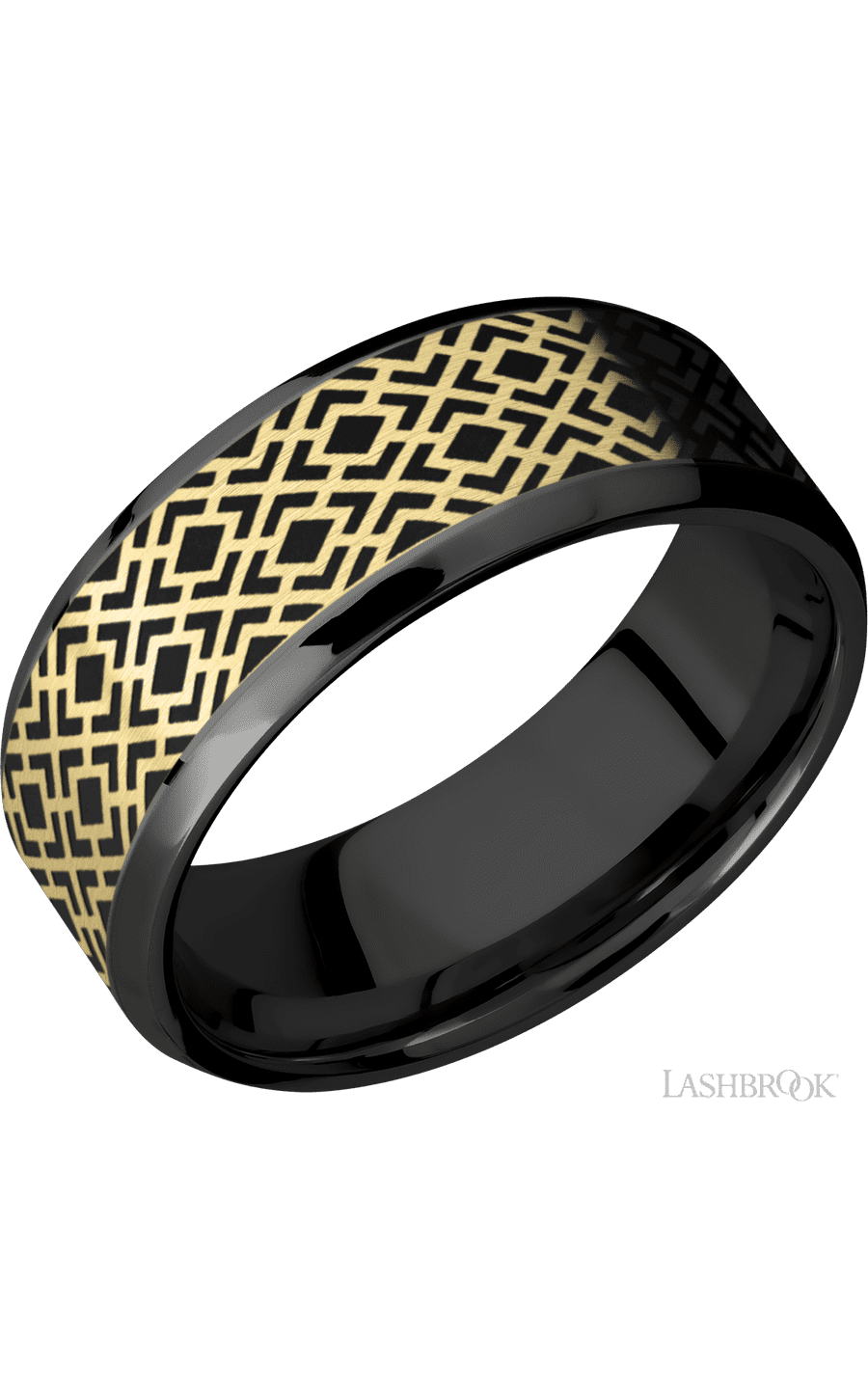 8 mm wide/Beveled/Zirconium band with one 6 mm Centered inlay of 14K Yellow Gold with a laser carved Trellis 2 pattern.