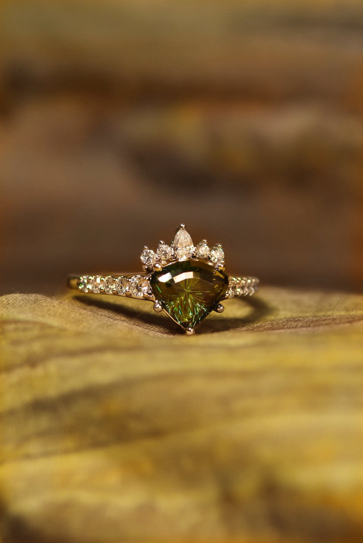 This custom sapphire ring features a fantasy cut and diamond accent stones along the band.